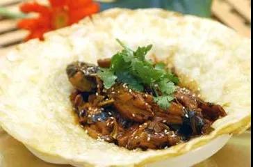 文樓湯包,皮面筱薄,點(diǎn)火就著;包內(nèi)餡心以肉皮、雞丁、肉塊、蟹黃、蝦米、竹筍、香料、紹興酒等十二種配料混合而成,先加溫成液體,后冷卻凝固。把冷凍后的餡心納入包內(nèi),入籠而蒸,出籠湯包中的餡心成液體,用手撮入碟內(nèi),倒上香醋,撒上姜米,再用香菜,上席后,食用時(shí)以餐具點(diǎn)孔,用嘴吸入,湯鮮美可口。