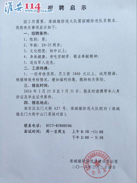 淮安區(qū)淮城鎮(zhèn)防違大隊招聘防違隊員數名相關圖片信息