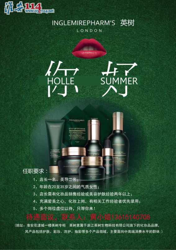 淮安花漾城英樹專柜九兒化妝品店招聘店長和美導,要求女性,年齡18歲以上,學歷不限,有意者請電話聯(lián)系。