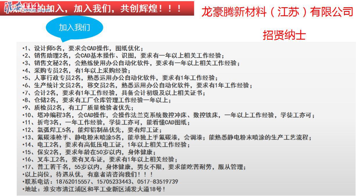 淮安百姓網(wǎng)關(guān)鍵詞:2020年龍豪新材料有限公司招賢納士