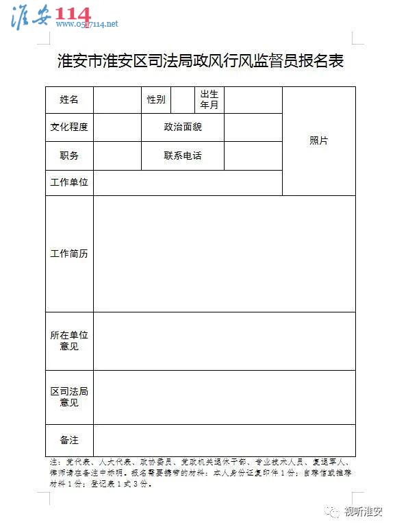 (一)報名申請:有意報名擔(dān)任政風(fēng)行風(fēng)監(jiān)督員人員需填寫《淮安區(qū)司法行政系統(tǒng)政風(fēng)行風(fēng)監(jiān)督員申請表》,表格可在通過本公告附件下載獲取,或到淮安區(qū)城西北路111號淮安區(qū)公共法律服務(wù)中心窗口領(lǐng);同時提供居民身份證復(fù)印件1份、一寸免冠彩色照片2張(或照片電子底版),并于2021年5月15日前將有關(guān)材料郵寄或直接交至區(qū)司法局辦公室,也可將有關(guān)材料直接交至淮安區(qū)公共法律服務(wù)中心窗口。