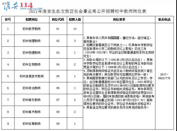 招聘崗位、人數(shù)和相關(guān)要求詳見《2021年淮安生態(tài)文旅區(qū)社會(huì)事業(yè)局公開招聘初中教師崗位表》。
