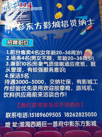 淮安百姓網(wǎng)關(guān)鍵詞:淮海西路中影東方影城招聘前臺售賣員、場務(wù)、保潔、兼職