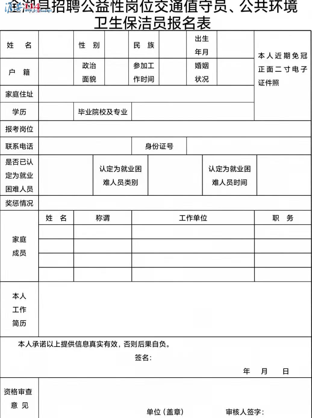 金湖縣招聘公益性崗位交通值守員、公共環(huán)境衛(wèi)生保潔員報名表相關(guān)圖片信息