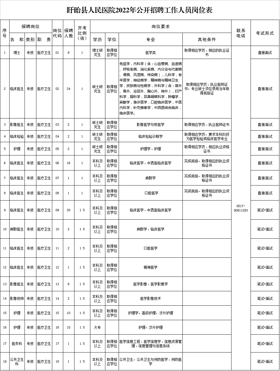 附件1:盱眙縣人民醫(yī)院2022年公開招聘工作人員崗位表
