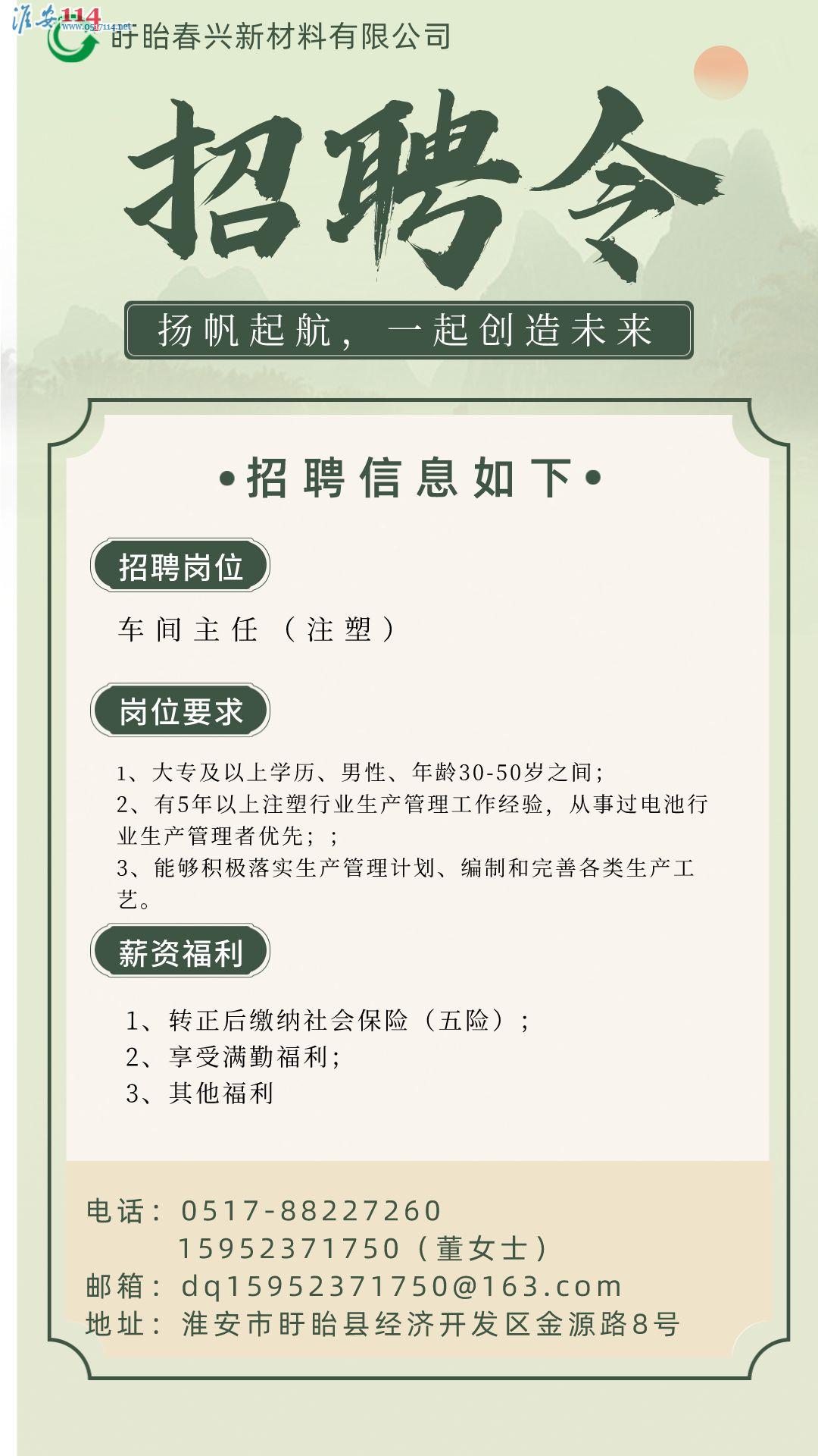 淮安百姓網(wǎng)關鍵詞:盱眙春興新材料有限公司招聘車間主任(注塑)