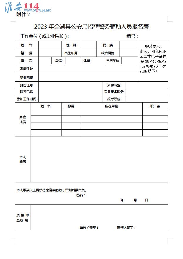 2.2023年金湖縣公安局招聘警務(wù)輔助人員報(bào)名表;