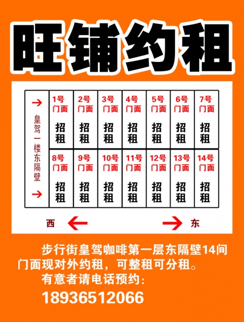 步行街皇駕咖啡第一層?xùn)|隔壁14間門(mén)面現(xiàn)對(duì)外約租,可整租可分租。有意者請(qǐng)電話預(yù)約!